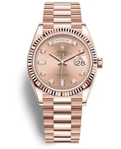 A brand new authentic Rolex Day-Date model 128235-0009. Features an 18kt Everose Gold case, an additional bracelet also made of 18kt Everose Gold with a Crownclasp clasp. Includes fixed fluted bezel and rose gold-toned dial with pink diamond hour markers and date display at the three o'clock position. Equipped with automatic Rolex Calibre 3255 movement offering a 70-hour power reserve, round case shape measuring 36mm in diameter. Comes with solid case back, scratch-resistant sapphire crystal, and is rated for 100 meters / 330 feet water resistance. Includes the standard 5-year WatchMaxx warranty.