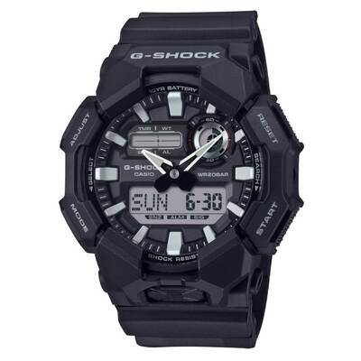 Black bio-based carbon/bio-based resin case with a black bio-based resin strap. Fixed black bezel. Black dial with silver-tone hands and index hour markers. Dial Type: Analog-digital. Full auto-calendar (to year 2099). Quartz movement. Scratch resistant mineral crystal. Solid case back. Round case shape, case size: 55.1 x 51.9 mm, case thickness: 17.5 mm. Buckle clasp. Water resistant at 200 meters / 660 feet. Functions: hour, minute, second, pm, month, date, day, 12/24-hour format, world time, timer, stopwatch, alarm. G-shock Series. Sport watch style. Watch label: Japan Movt. Casio G-Shock Alarm World Time Quartz Analog-Digital Watch GA-010-1ADR.