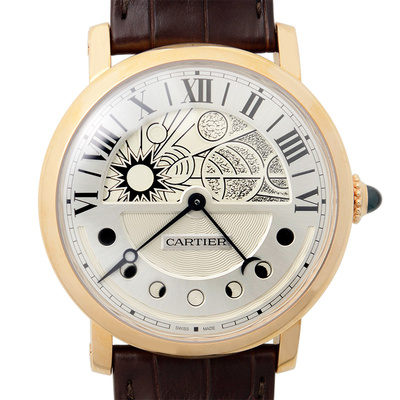 Analog white galvanized guilloche dial with blued-steel apple-shaped hands and black Roman numeral hour markers, featuring minute markers around the outer rim. 18kt pink gold round case equipped with a deployment clasp. Brown alligator leather strap. Fixed bezel in 18kt pink gold. Includes moon phase display and day/night indicator complication. Powered by Cartier Calibre 9912 MC automatic movement with 44 Jewels, composed of 290 parts, operating at 28800 vph, offering an approximate power reserve of 48 hours. Scratch-resistant sapphire crystal. Skeleton transparent exhibition case back. Water resistant to 30 meters / 100 feet depth.