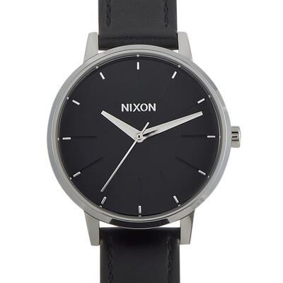 Stainless steel case with fixed bezel. Black leather strap secures the round 37 mm case. Black dial features silver-tone hands and index hour markers for analog time telling via quartz movement. Equipped with a scratch-resistant mineral crystal, pull/push crown, solid case back, and tang clasp. Water resistant to 50 meters / 165 feet depth. Belongs to the Kensington Series, presented as a luxury watch style.