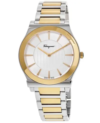 Authentic Salvatore Ferragamo model SFPE00922 men's watch. Features a two-tone steel bracelet and case with polished deployment buckle, gold tone bezel on a silver dial marked by stick hour indicators, and yellow gold tone hour/minute hands. Equipped with Swiss quartz movement using battery power. Water resistant up to 100 feet (30 meters). Unique slim design has a case thickness of 6.85mm.