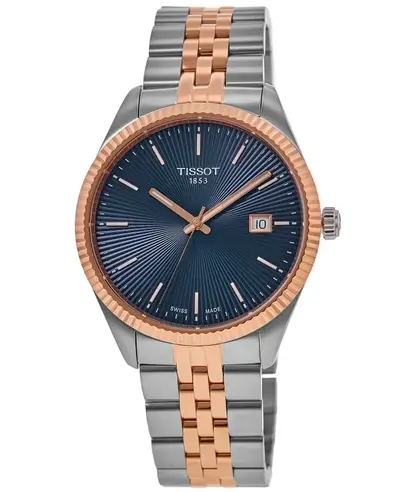 Two-tone steel men's watch with blue dial and fixed fluted bezel. Features brushed and polished stainless steel case combined with a rose gold PVD coating on the band and clasp (deployment type with push button). Includes luminous rose gold hands, stick hour markers, minute markers around outer rim, date at 3 o'clock position for display functions. Powered by Swiss Quartz movement Caliber 11 1/2''' . Equipped with a scratch-resistant sapphire crystal lens. Round case measuring 40mm diameter and 8.25mm thickness with solid case back. Offers water resistance up to 100 meters (330 feet). Comes with a 2-year WatchMaxx warranty; also known by model number T1564102204100.