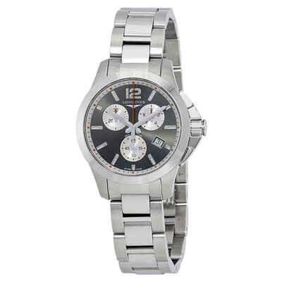 A stainless steel Longines mens' watch (code L33794796) featuring an analog black dial with silver-tone hands and index hour markers. It includes a fixed bezel, three sub-dials for chronograph functions displaying seconds, minutes, and hours respectively, deployment clasp closure, scratch resistant sapphire crystal lens, screw down crown mechanism, solid case back, date display at the 4 o'clock position, and is water resistant up to 1000 feet (300 meters).