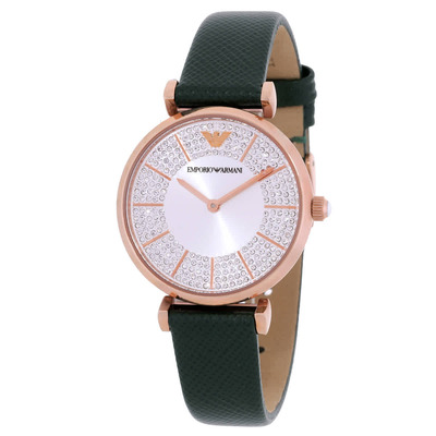 Rose gold-tone stainless steel case, green leather strap. Fixed rose gold-tone bezel. Silver dial with rose gold-tone hands and index hour markers; minute markers around the outer rim. Analog dial type driven by quartz movement. Equipped with scratch-resistant mineral crystal lens, pull/push crown mechanism, solid case back. Round shape measuring 32 mm in diameter with a 7 mm thickness. Band width is 14 mm secured by tang clasp. Water resistant to 30 meters / 100 feet depth. Functions: analog hour and minute display.