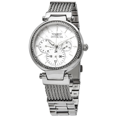 Analog quartz crystal silver dial ladies watch. Stainless steel case with fixed bezel set in crystals, stainless steel bracelet featuring cable wire inserts and fold over clasp. Includes three multi-function sub-dials for date, day of the week, and 24-hour function. Equipped with a TMI VH63 movement (Japanese). Water resistant to 100 meters / 330 feet depth.