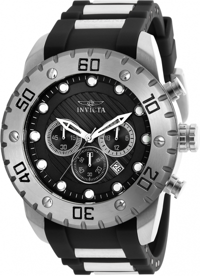 Silver-tone stainless steel case with two-tone (black and silver-tone) silicone and stainless steel bracelet. Includes a unidirectional rotating bezel, black dial accented by silver-tone hands and index hour markers. Features minute markers on the outer rim, luminous properties for visibility in darkness, date window at the 4 to 5 o'clock position, analog dial type. Equipped with chronograph functions featuring three sub-dials: seconds (60-second), minutes (60-minute), and hours (24-hour). Powered by Hattori Caliber VD53 quartz movement, a Japan Movt product. Crystal is scratch-resistant Flame Fusion material. Secured with a pull/push crown and solid case back. Round 50mm size with thickness of 12.5mm; black dial band width measures 26 mm. Strap length adjustment up to 8.50 inches via buckle clasp closure. Water resistant to 100 meters / 330 feet, suitable for swimming and snorkeling. Functions include chronograph, date display, GMT second time zone indication.