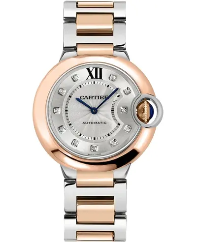 The Cartier Ballon Bleu is a women's luxury watch with an automatic movement, model number W3BB0007. It features an elegant silver dial accented by polished blue hands and diamond Roman numeral hour markers set against a polished 18K rose gold bezel rimmed with minute markers. The case combines polished 18K rose gold and stainless steel construction. Supplied with an authentic polished stainless steel folding clasp band matching the bezel finish. Luminous markers for optimal legibility, round shape measuring 36mm diameter at a thickness of 12mm. Secure solid case back closure protects internal components including the Calibre 076 engine known for its Swiss automatic movement and providing up to 38 hours power reserve. Essential functions display hour and minute readings; includes push-pull crown access with water resistance rated at 30 meters or approximately 100 feet depth.