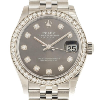 Ladies automatic watch featuring a silver-tone stainless steel and white gold case. Equipped with an 18k white gold Jubilee bracelet, screw-down crown, and a screw-down case back. The dark grey dial displays analog functions including hour, minute, second and date at the 3 o'clock position. Movement is Rolex Calibre 2236 automatic, boasting 31 jewels and a frequency of 28800 vph (50' per hour). Power reserve approximates 55 hours. Features diamond set bezel markers and silver-tone hands on a dark grey dial. Protected by scratch resistant sapphire crystal. Water resistant to 100 meters / 330 feet. Round case shape measures approximately 31 mm in diameter, finished with a folding clasp.