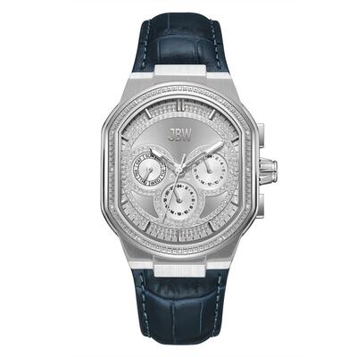 Silver-tone stainless steel case, blue crocodile leather strap 24mm width. Fixed silver-tone bezel, scratch-resistant mineral crystal face with silver-tone hands and index hour markers. Minute track around outer rim, three sub-dials for date and two types of 24-hour display. Automatic Miyota Caliber JP25 movement (Japan). Pull/push crown control, solid case back. Oval shape measuring 39mm diameter by approximately 12mm thickness. Casual style watch with day function, water resistant to 50 meters / 165 feet.