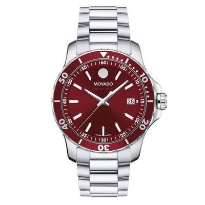 Sport watch with Swiss Made label, featuring an analog dial type and quartz movement for precise timekeeping. It boasts a red dial accented by silver-tone hands and index hour markers, along with minute markers around the outer rim. The unidirectional rotating aluminum bezel is colored in red. Constructed from a silver-tone stainless steel case and bracelet that also includes scratch-resistant sapphire crystal material. Includes date display at 3 o'clock position, deployment with push button release clasp for secure fastening, screw down crown mechanism, solid case back design, round shape measuring 40 mm in size, and is water resistant to a depth of 200 meters or 660 feet.