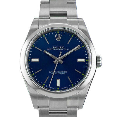 A pre-owned men's analog blue dial watch with silver-tone stainless steel case and bracelet. Features a screw-down crown, fixed bezel, luminous hands/markers, sapphire crystal, solid case back, automatic chronometer movement (calibre 3132) with approximately 48 hours power reserve at 28800 vph/bits, fold over clasp with safety release, water resistance to 100 meters/330 feet. Model Oyster Perpetual 39 Series.