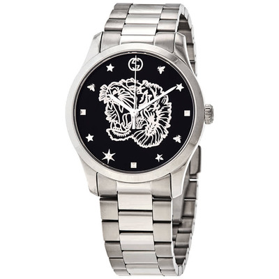 Black Dial Stainless Steel Case Ladies Watch with Stainless Steel Bracelet and Fixed Bezel. Features a Black Dial, Silver-tone Hands, Star and Bee Hour Markers, Analog Movement, Scratch Resistant Sapphire Crystal, Pull/Push Crown, Solid Case Back, Round Shape 38mm Diameter 8mm Thickness, Band Width 20mm equipped with Fold Over Clasp and Push Button Release mechanism. Water resistant to 50 meters / 165 feet depth capable of measuring hours minutes seconds functions only Dress Watch Style Swiss Made