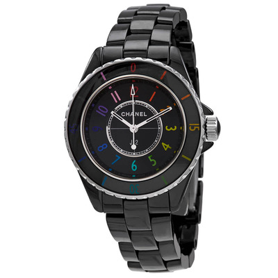 Black ceramic case, black ceramic bracelet. Uni-directional stainless steel bezel with black ceramic insert ring. Black lacquered dial featuring black hands and Arabic numeral hour markers. Minute scale around inner ring. Analog dial type. Luminescent hour markers and hands. Quartz movement. Scratch resistant sapphire crystal. Screw down winding crown. Solid case back. Round 33 mm case shape, 12.94 mm thickness. Hidden fold over clasp. Water resistant to 200 meters (660 ft). Functions: hours, minutes, seconds. Includes original box and manual. J12 Electro Series. Luxury watch style with Swiss Made label.
