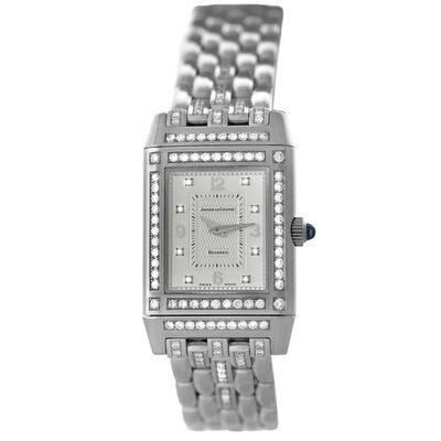 Brand: Jaeger-LeCoultre, Model Number: 267.3.08, Type: Pre-owned Reverso Series Ladies Analog Quartz watch with silver dial and diamond accents. Case Material: Solid 18kt white gold set with diamonds. Bracelet Included: Yes, in addition to the case; fixed bezel also features diamond-set 18kt white gold. Dial Features: Silver-tone sunburst or matte finish dial (depending on display), accented by silver-tone hands and luminous diamond hour markers positioned at each hour mark. Minute scale is present around the inner rim of the dial providing minute indicators. Movement: Precise quartz movement ensuring accurate timekeeping. Crown: Cabochon-style winding crown, typically non-water resistant unless specified otherwise. Case Back: Solid case back included with the watch. Case Shape: Rectangle shape characteristic to Reverso models. Case Size: 21 mm lug-to-lug width (approximately). Band Length: 6.5 inches or equivalent circumference. Clasp Type: Fold-over clasp equipped with a safety release mechanism for secure wearing. Functions Included: Analog hour and minute display only, basic luxury watch functions.