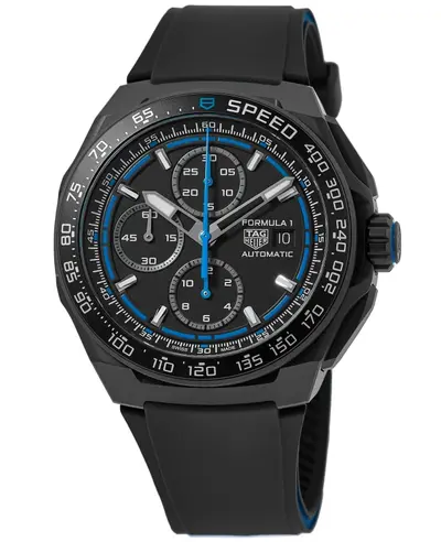 Authentic Tag Heuer Formula 1 model CBZ2084.FT8097. Round automatic chronograph movement with fixed Tachymeter Scale bezel, Date function at the 3 o'clock position, Power Reserve indicator, Hour markers, Minute markings and Luminous Grey hands around a Black DLC Titanium case. Equipped with a screw down crown, Scratch Resistant Sapphire crystal glass, Sub-dials displaying seconds/centiseconds (1/10th), minutes (30 min) and hours (12 hr). Water resistant to 200 meters (660 feet).