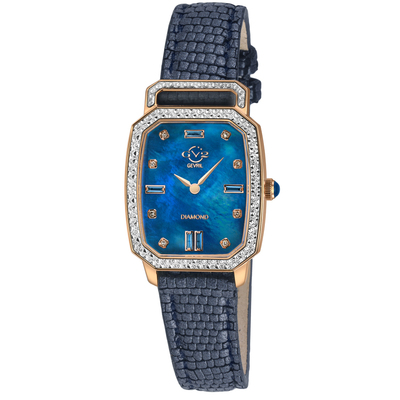 Rose gold-tone stainless steel case, blue leather strap with fixed rose gold-tone bezel. Mother-of-pearl dial accented by rose gold-tone hands and diamond hour markers. Analog display powered by a Ronda Caliber 762 quartz movement. Features scratch-resistant sapphire crystal glass, pull/push crown, solid case back, rectangle shape measuring 29mm diameter x 7mm thickness. Strap width: 12.5 mm; strap length (case): Approximate 7.5 inches. Equipped with a buckle clasp and rated water resistant to 30 meters / 100 feet.