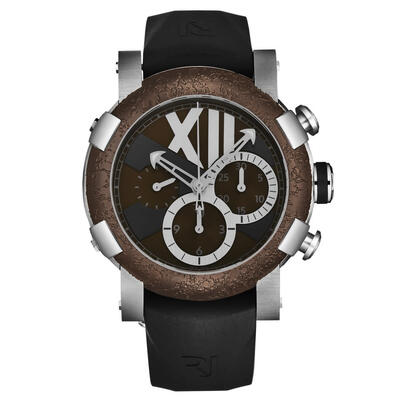 Automatic movement chronograph wristwatch for men with brown dial and black rubber strap. Features fixed stainless steel bezel, luminous silver-tone hands, scratch resistant sapphire crystal glass face, round case measuring 46 mm in diameter and 14.5 mm thick, deployment clasp closure, water resistance to 30 meters / 100 feet.