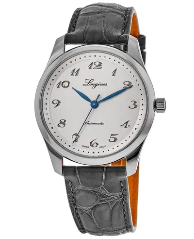 Authentic Longines Master Collection Automatic watch, men's dress timepiece model L2.793.4.73.2 or L27934732. Features polished stainless steel case and fixed bezel with silver dial displaying polished blue hands and Arabic hour markers plus minute markers around the outer rim. Equipped with a grey alligator leather strap secured by a polished stainless steel folding clasp. Powered by Swiss Automatic Caliber L888 movement ensuring accurate timekeeping with a 72-hour power reserve function. Includes indicators for hours, minutes, seconds; scratch-resistant sapphire crystal lens provides durable protection. Round case shape measures 40mm in diameter and has a thickness of 9.3mm. Comes with see-through caseback and offers water resistance up to 30 meters (100 feet). Backed by a 5-year WatchMaxx warranty.