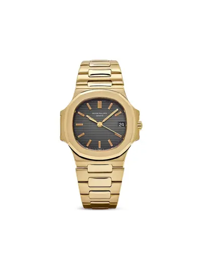 Patek Philippe Pre-Owned Nautilus model 29631022 from 1983, featuring a yellow gold cushion case with an index dial displaying central hours minutes seconds automatic movement and day date function secured by a screw-down winding crown equipped with an adjustable link bracelet fastened using a deployant clasp. This watch has been evaluated authenticated by WRIST AFICIONADO watchmakers and comes with a standard one year warranty from the boutique. Condition: EXCELLENT, near perfect with no signs of damage or use.