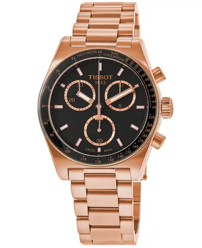 Authentic Tissot PRS 516 Chronograph model t149.417.33.051.00. Case: Brushed and Polished Rose Gold PVD Coated Stainless Steel, fixed with a Brushed and Polished Rose Gold PVD Coated Stainless Steel folding band clasp. Bezel: Fixed with Tachymeter Scale. Dial: Black with Luminous Rose Gold Tone hands, stick hour markers featuring minute markers around the outer rim, three sub-dials displaying 1/10th of a second, seconds, and minutes respectively. Movement: Swiss Quartz Caliber 13 (movement also known as 13 1/4 line). Functions: Hour, Minute, Second, Chronograph with battery end-of-life indicator via crown press-push action. Crown: Push-Pull type. Crystal: Scratch Resistant Sapphire. Case Shape: Round; Size: 40mm diameter; Thickness: 12.10mm. Water Resistance: Suitable for swimming up to 100 meters / 330 feet depth. Engraved case back. Comes with a 2-year WatchMaxx warranty.