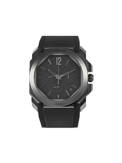 Pre-owned Bulgari Octo L'Originale in EXCELLENT condition. Features a black stainless steel octagonal case with automatic movement, screw-down crown and skeleton case back. Includes Arabic numerals dial, sword-shaped hands, three chronograph sub-dials, date indication at the 3 o'clock position, and a rubber strap with pin-buckle fastening.