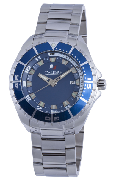 Fixed blue stainless steel bezel. Analog quartz movement with luminous hands and markers. Date display at 3 o'clock position. Scratch-resistant mineral crystal. Silver-tone dial with silver-tone hour/minute hands and index markers featuring a tachymeter scale around the outer rim. Includes fixed blue steel bezel, solid case back, round shape measuring 44mm diameter by 14mm thickness. Band width: 21 mm equipped with deployment clasp. Water resistant to 100 meters / 330 feet depth.