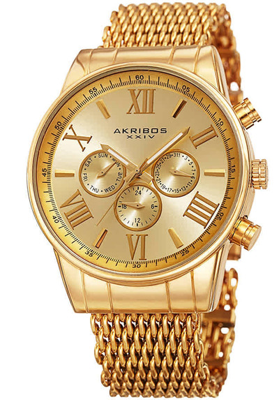 A yellow gold-tone alloy case with a yellow gold-tone stainless steel bracelet. Features a gold-tone dial with luminous fill, Roman numeral and index hour markers, minute markers around the outer rim, and luminescent hands for visibility in low light conditions. Equipped with three sub-dials displaying date, day, and 24-hour functions alongside analog hour/minute/second displays. Powered by quartz movement. Comes with a scratch-resistant mineral crystal lens. Has a pull/push crown for setting time and other functions, solid case back. Analog dial type with hours, minutes, seconds displayed primarily on the main dial, plus date and day indicated by sub-dials. Round case shape measuring 45 mm in diameter and 12 mm thick. Band width is 22 mm, length approximately 7.5 inches (adjustable). Secured by a fold over clasp closure. Water resistant up to 30 meters / 100 feet depth. Enterprise Series. Swiss Made. Casual watch style.