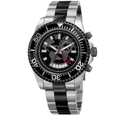 Men's Akribos XXIV Quartz watch. Model P50173 features black dial with gray accents, silver-tone and red hands. Silver-tone stainless steel case paired with a two-tone (silver/black) stainless steel bracelet. Includes fixed black bezel, date display at 6 o'clock position, small subdial for seconds, analog display type, minute markers on the outer rim, luminous coating on hands/markers, round 44mm face thickness 11mm, band width 22mm and length approx 8.5 inches (case included), fold over clasp closure, scratch resistant Krysterna crystal, solid case back, water resistance to 50 meters / 165 feet, GMT functionality with second time zone display, hour/minute/second indicators.