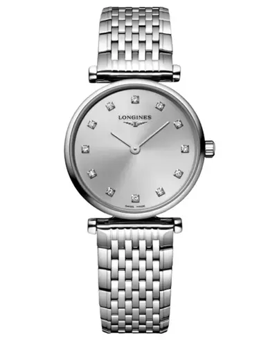 Authentic Brand New Longines La Grande Classique watch model L4.209.4.70.C featuring a polished stainless steel case and bracelet, round shape with 24mm diameter and 4.3mm thickness, solid case back. The sunray grey dial includes diamond hour markers and polished grey hands. Powered by Swiss quartz movement (Caliber L420) and equipped with sapphire crystal glass for scratch resistance. Water resistant up to 100 feet or 30 meters. Comes with a standard 2-year WatchMaxx warranty.
