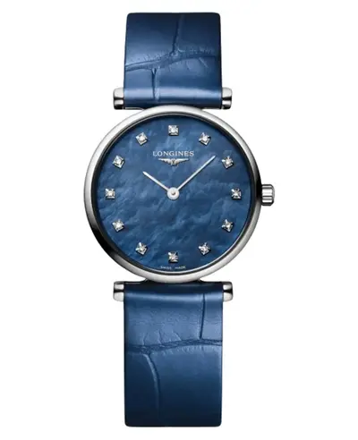 Precise Swiss quartz movement Longines Caliber L209, polished stainless steel case with smooth bezel and solid back, blue mother-of-pearl dial accented by diamond hour markers and silver tone polished hands, fitted with a 24mm diameter leather strap secured by a polished stainless steel tang clasp. Water resistant to 30 meters (100 feet), scratch-resistant sapphire crystal glass. Features include hour and minute display via pull/push crown.