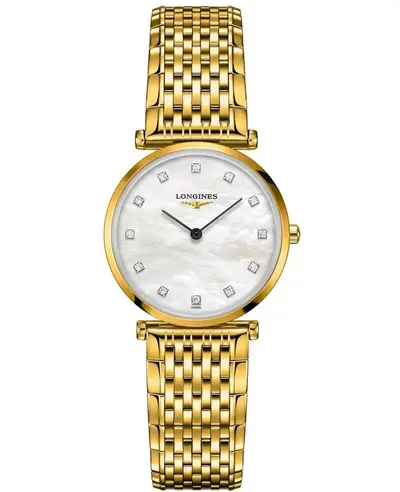 Women's watch Longines La Grande Classique Quartz movement, Black mother of pearl dial with diamond hour markers and black hands, Yellow gold PVD case shape round size 29mm thickness 4.5mm solid back, Yellow gold PVD folding band clasp, Scratch resistant sapphire crystal, Water resistant to 30 meters (100 feet), Includes WatchMaxx warranty 2 years