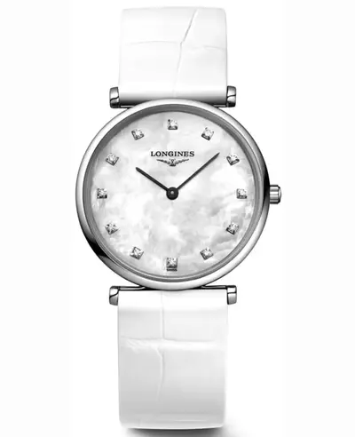 Authentic Longines quartz movement watch with mother-of-pearl dial featuring diamond hour markers and black hands. Equipped with sapphire crystal, tang clasp closure, round stainless steel case measuring 29mm diameter and 4.5mm thickness. White alligator leather strap included. Water resistant to 100 feet/30 meters. Comes with a 2 year WatchMaxx warranty.