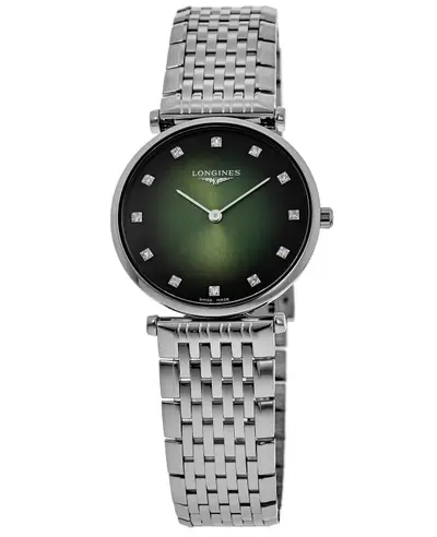 L4.512.4.92.C stainless steel case, 29mm diameter, 4.5mm thickness, solid case back. Stainless steel bracelet with deployment clasp and push button. Silver tone hands and diamond hour markers on a green dial. Quartz movement powered by Longines Caliber L420 engine. Hour/minute functionality. Scratch-resistant sapphire crystal lens. Water resistant to 30 meters (100 feet). Comes with a 2 year WatchMaxx warranty.