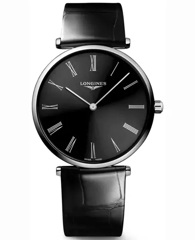 Women's watch with stainless steel case and black alligator leather strap equipped with a tang clasp. Features a black dial accented by silver tone hands and Roman numeral hour markers. Powered by Longines Caliber L420 quartz movement, ensuring accurate timekeeping. Equipped with scratch-resistant sapphire crystal for the transparent front. Round shape in 38mm case size (thickness: 5.4mm), solid case back. Water resistant to 30 meters (approx. 100 feet). Comes with a 2 year WatchMaxx warranty.
