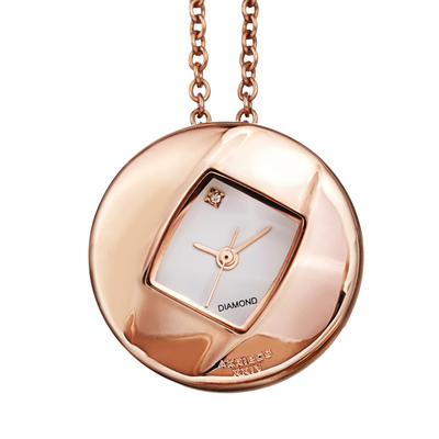 A ladies' fashion watch featuring an analog quartz movement, rose gold-tone composite metal case with a fixed alloy bezel and included chain measuring 31 inches. The white dial is accented by rose gold-tone hands and has a diamond set at the 12 o'clock position; equipped with scratch-resistant mineral crystal, push/pull crown for setting time, solid case back, round shape in size of 28mm thickness 9mm. Water resistant to 30 meters or 100 feet.