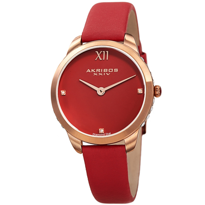 Composite metal case with gold-tone finish and crystal accents. Red leather strap fixed via tang clasp. Analog dial featuring Roman numeral at 12 o'clock, rose gold-tone hands, diamond hour markers at the 3rd, 6th and 9th positions. Quartz movement powered by battery (movement type not specified). Scratch resistant mineral crystal lens. Pull/push crown for time setting. Solid case back. Round case shape measuring 34 mm diameter with a thickness of 8.5 mm. Band width is 14 mm, band length approximately 7 inches. Water resistant to 30 meters / 100 feet depth. Functions include hour and minute display only.