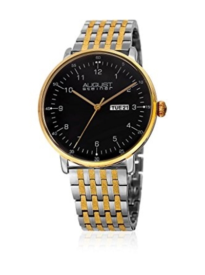 Silver-tone alloy case with two-tone (silver-tone and gold-tone) stainless steel bracelet. Fixed silver-tone alloy bezel. Black dial featuring gold-tone hands and Arabic numeral hour markers, also includes minute markers at the outer rim every 5 minutes. Analog quartz movement. Scratch resistant sapphire crystal. Pull/push crown for setting time. Solid case back. Round case shape measuring 44 mm in diameter and 14 mm thick. Band width is 20 mm with a hidden fold over clasp. Water resistant up to 30 meters / 100 feet depth. Functions include date, day of the week, hour, minute, second indications displayed at the 3 o'clock position. This watch features a casual style.