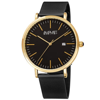 Vintage style August Steiner men's watch. Features a black dial with gold-tone hands and index hour markers, minute markers on the outer bezel. Gold-tone composite metal case and black leather strap. Equipped with quartz movement for accuracy, scratch-resistant Hardlex crystal lens. Pull/push crown for time setting, solid case back. Analog dial displaying hours, minutes, seconds and date at 3 o'clock position. Round shape measures 40mm in diameter and is 9mm thick. Includes a tang clasp. Water resistant to 100 feet (30 meters).