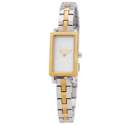 Gold-tone stainless steel case ladies watch with two-tone silver and gold stainless steel bracelet, fixed bezel, analog white dial featuring index hour markers and golden tone hands. Equipped with quartz movement mechanism and scratch-resistant mineral crystal lens. Includes pull/push crown functionality, solid case back closure, measures at a size of 31mm rectangle shape. Band width is 8mm, secured via deployment clasp with push button release. Water resistant to depths up to 30 meters or 100 feet; functions are hour and minute display only.