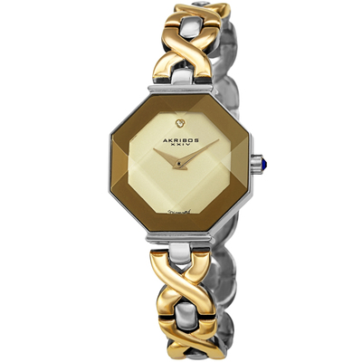 Gold-tone brass case with a gold-tone alloy bracelet featuring silver-tone links. Fixed gold-tone bezel and gold dial accented by gold-tone dauphine-style hands, a single diamond set at the 12 o'clock position, analog dial type, quartz movement, scratch-resistant mineral crystal lens, pull/push crown mechanism, solid case back. Case shape is octagon measuring 28 mm wide x 9 mm thick. Band width is 12 mm and length is 8.5 inches with a jewelry clasp closure. Water resistant to 30 meters (100 feet). Functions include hour and minute display.