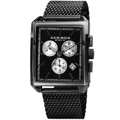 Black alloy case with black-plated stainless steel mesh bracelet. Features a fixed black alloy bezel and a black dial equipped with luminous black hands and index hour markers for clear night-time readability. Analog dial type includes luminescent hands and markers, displaying the date between 4 and 5 o'clock positions. Equipped as a chronograph with two silver sub-dials: one showing elapsed seconds up to 60, another indicating minutes passed up to 30, plus an additional date sub-dial for secondary time reference. Powered by a precise quartz movement ensuring accurate timekeeping. Features a scratch-resistant mineral crystal lens protecting the dial. Includes a pull/push crown for setting functions and a solid case back providing complete enclosure. The rectangular case measures 34mm in width with a thickness of 11mm, paired with a band that has an outer width of 22mm and length approximately 7.5 inches (suitable for men's wrist). Secured by a fold over slip through clasp designed for easy adjustment and safe locking mechanism. Water resistant up to 30 meters / 100 feet depth, suitable for general splashes and shallow water activities but not professional diving. Functions include chronograph timing, date display, hour/minute/second analog reading. Belongs to the Womens Casual Series collection with a casual watch style intended for everyday wear.