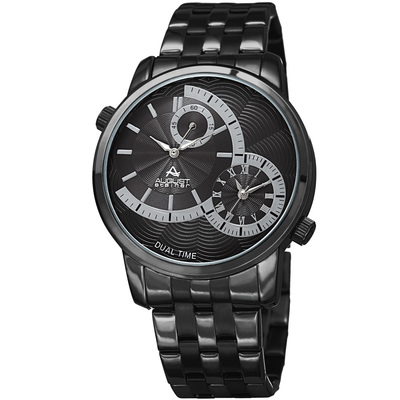a black-plated composite metal case with a fixed black bezel, grey dial featuring analog time display and dual time functions, arrow-shaped silver-tone hands pointing to hours and minutes, index hour markers for clarity, minute markers on the outer rim, small seconds sub-dial, powered by a precision quartz movement, protected scratch-resistant mineral crystal lens, equipped with a pull/push crown for setting, solid case back closure, round case shape measuring 44 mm in diameter and 9 mm thick, black-plated stainless steel bracelet is 22 mm wide and can be adjusted to an approximate length of 8 inches (20 cm), fastens securely with fold over clasp mechanism, water resistant up to 30 meters / 100 feet for everyday use, includes functions for hour, minute, second indication via analog hands and sub-dial. Part of the Dual Time Series collection designed as a fashion watch.