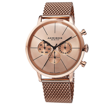 Rose gold-tone stainless steel case mesh bracelet fixed rose gold-tone bezel sunray dial black hands index hour markers date day display at 3 and 9 o'clock three sub-dials for date day of week 24-hour quartz movement scratch-resistant plastic crystal pull-push crown screw-down case back round shape dimensions 42mm diameter x 11mm thickness band width 20mm slip-through fold-over clasp water resistance 50 meters functions analog time with hour minute second indicators plus date and day display casual style Hong Kong brand