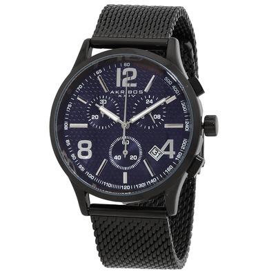 Black-plated stainless steel case, black-plated stainless steel mesh bracelet with slip through clasp. Fixed black-plated bezel set in the round 42.5 mm diameter x 11 mm thick case. Analog blue dial featuring etched pattern showing luminous grey hands and index hour markers (including Arabic numerals at 4, 8, 12 o'clock). Tachymeter scale around outer rim, date display between 4-5 o'clock via sub-dial with Roman numeral markings. Chronograph functions include two sub-dials for measuring elapsed time: one for seconds and minutes up to 30 minutes total, plus a date function on the same sub-dial or separate indicator (description specifies both options). Quartz movement ensures precise Japanese timekeeping. Scratch resistant mineral crystal lens protects the etched blue dial. Pull/push crown allows regulation of functions while screw down case back provides added water resistance suitable for casual wear up to 30 meters depth. Functions include hours, minutes, seconds, date display and tachymeter measurement.