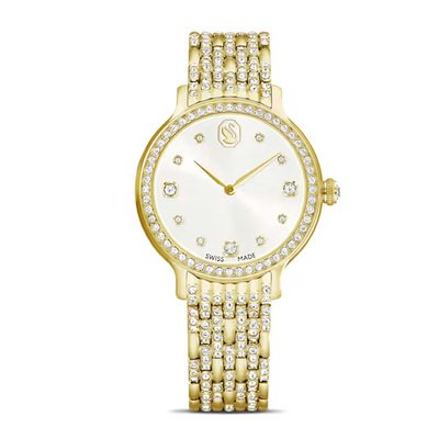 Gold-tone metal case and bracelet. Fixed gold-tone metal bezel paved with 52 clear crystals. Silver-toned dial featuring gold-tone hands and crystal hour markers for durability; scratch resistant mineral crystal lens. Swan logo positioned at the 12 o'clock mark. Analog quartz movement. Round watch case measuring 32 mm in diameter, 6.35 mm thick. Butterfly clasp closure. Water resistant to a depth of 50 meters / 165 feet. Functions include hour and minute display only. Imber Series dress watch style. Swiss Made.