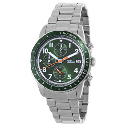 Men's Fossil Sport Tourer Chronograph Quartz watch with green dial, silver-tone stainless steel case and bracelet. Features fixed tachymeter bezel, scratch resistant mineral crystal, luminescent hands and markers for night readability, analog dial displaying Arabic numeral hour markers and minute markers around the outer rim. Includes date display at 3 o'clock position and a chronograph complication with three sub-dials (60 second counter, 60 minute counter, 12 hour counter). Equipped with quartz movement ensuring accurate timekeeping, pull/push crown for easy adjustment, solid case back. Round case shape measuring 42 mm in diameter, band width of 22 mm on a fold over clasp with safety release mechanism. Water resistant to 50 meters / 165 feet.