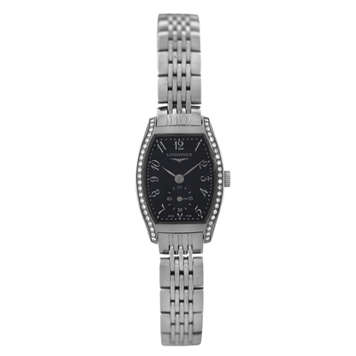 Silver-tone stainless steel case and bracelet, fixed bezel set with diamonds on a stainless steel band, black dial featuring silver-tone hands and Arabic numeral hour markers, minute markers around the outer rim, one subdial displaying small second function, powered by Longines Calibre L178 quartz movement, scratch resistant sapphire crystal glass face, solid case back, tonneau shaped 20mm case size, equipped with a fold over clasp including safety release mechanism, water resistance up to 30 meters or 100 feet, analog functions include hour, minute and small second display.
