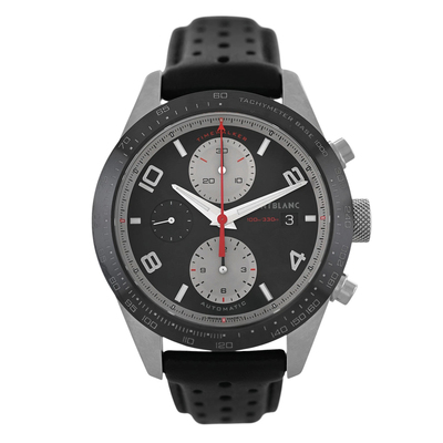 A pre-owned ladies automatic chronograph watch from the Montblanc Timewalker series. Features a black dial with silver-tone hands, Arabic numeral and index hour markers, luminous indicators, date display at 3 o'clock, fixed black ceramic bezel with tachymeter scale, sapphire crystal glass, round case size of 41 mm in silver-toned stainless steel, black leather strap with buckle clasp, Swiss movement Calibre MB 25.07 containing 25 jewels and operating at 28800 vph (60,000 bpm), approx 46-hour power reserve, solid case back, water resistant to 100 meters.