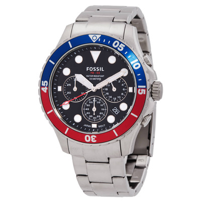 Stainless steel case with stainless steel bracelet. Fixed bezel featuring an inlaid red and blue ring. Black dial equipped with luminous silver-tone hands and dot hour markers, Minute markers on the outer rim. Analog dial type displaying date between 4 and 5 o'clock positions. Chronograph sub-dials for seconds (60 sec), minutes (30 min) and hours (24 hr). Powered by a quartz movement. Scratch resistant mineral crystal lens. Solid case back. Round unisex style, 46mm diameter, 14mm thick. Band width is 22 mm secured with a deployment clasp.