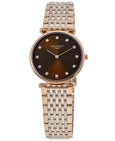Authentic Longines women's quartz watch featuring a brown dial with rose gold tone hands and diamond hour markers. Constructed from stainless steel case and band finished in both stainless steel and rose gold plating, equipped with a secure folding clasp closure. Powered by battery-operated quartz movement displaying hours and minutes only. Secured sapphire crystal offers scratch resistance. Possesses a round 29mm diameter case measuring 4.5mm thick; solid case back included. Rated at 30 meters / 100 feet water resistance depth, Longines WatchMaxx warranty provided for two years.